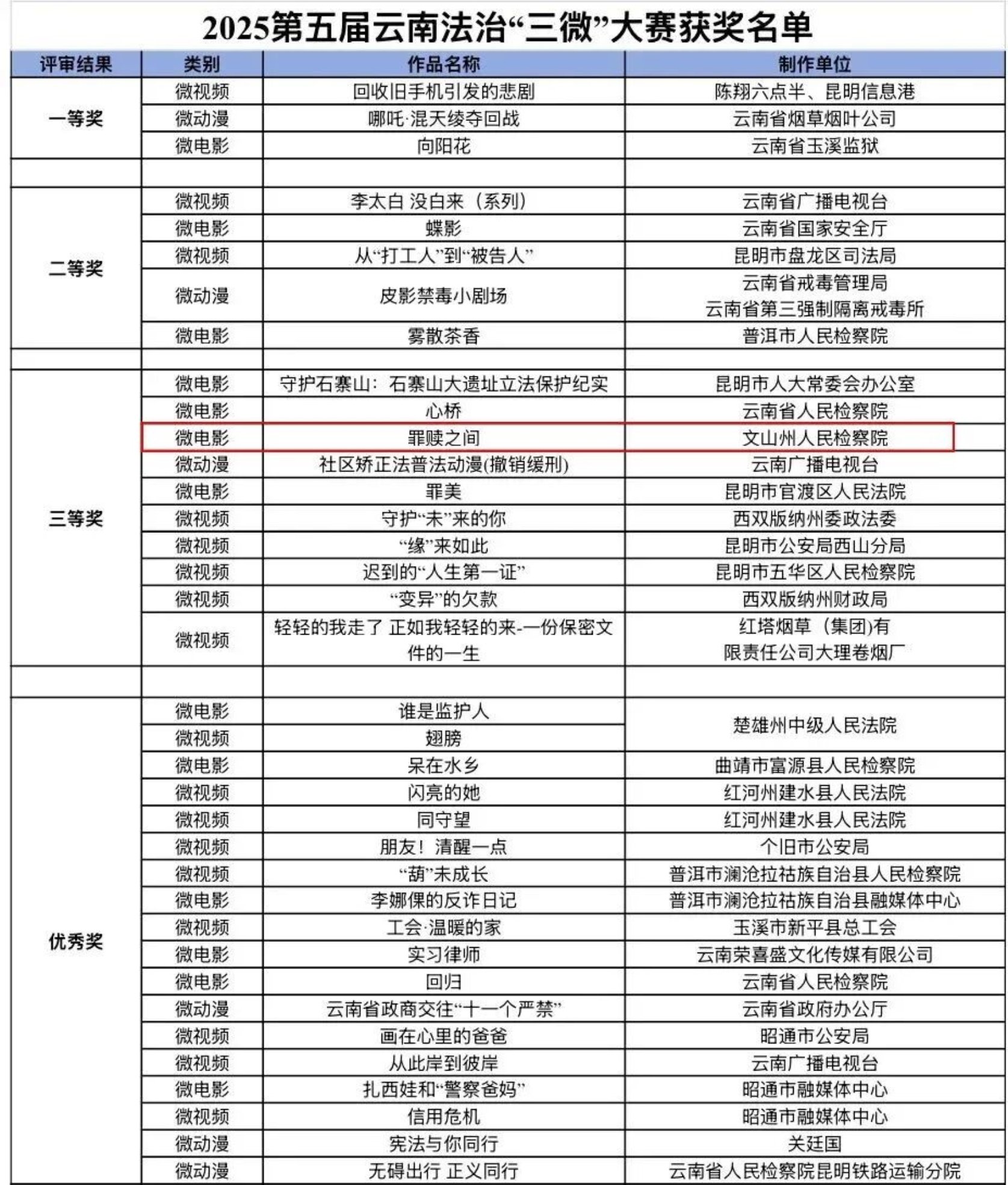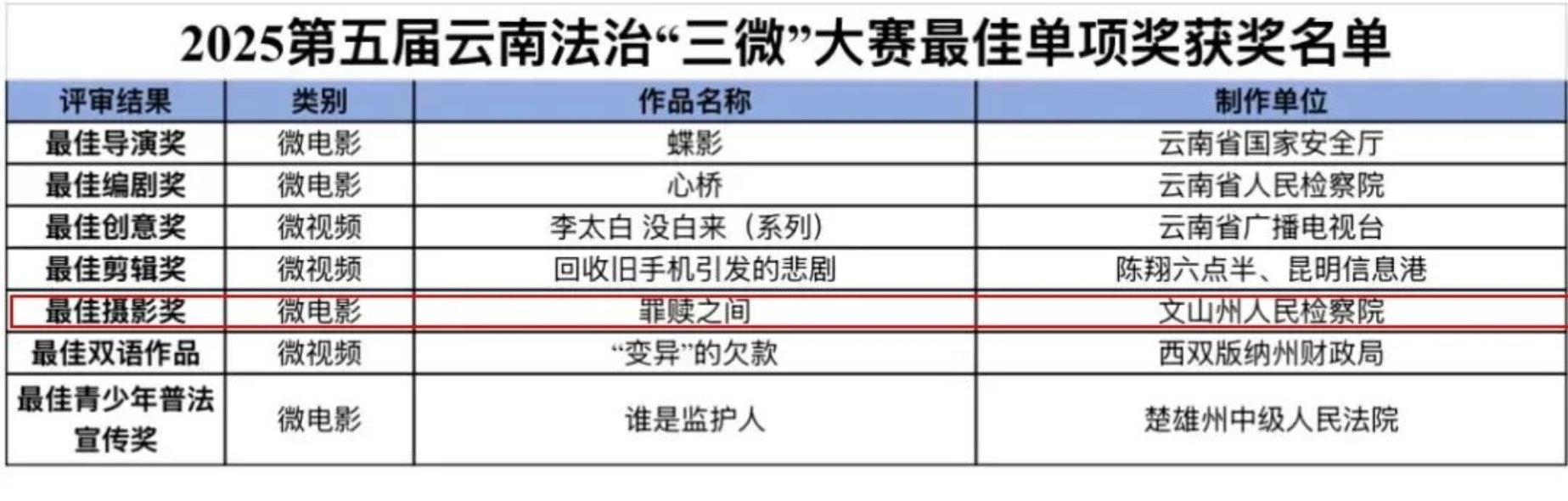 9月1日,由中共云南省委宣传部、中共云南省委政法委员会、中共云南省委网络安全和信息化委员会办公室、中共云南省委全面依法治省委员会办公室、云南省司法厅、云南省广播电视局、云南省社会科学界联合会、云南省普及法律常识办公室联合主办,由云南网具体承办的云南省第五届法治微电影微视频微动漫大赛公示评审结果,文山州人民检察院报送的微电影《罪赎之间》在全省160家单位(个人)的889件(组)报名作品中脱颖而出,获得“最佳摄影奖”、“三等奖”2个奖项。