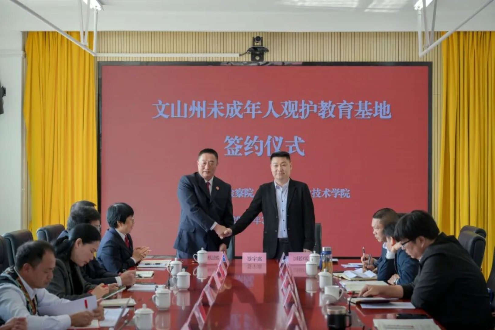 文山州人民检察院与文山职业技术学院现场签订协议,联合成立“文山州未成年人观护教育基地”,进一步深化校检合作,构建全方位、全链条未成年人保护体系。