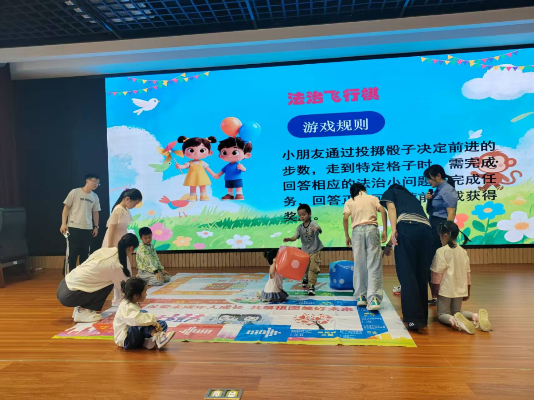 趣味游戏环节妙趣横生,“抢凳子识颜色”、“投球比赛”、“法治飞行棋”等巧妙融入了法治元素。通过寓教于乐的方式向孩子们传递规则意识,让学法的过程变得生动有趣,记忆深刻,现场掌声与笑声不断,孩子们在欢声笑语中实现了“玩中学,乐中悟”。
