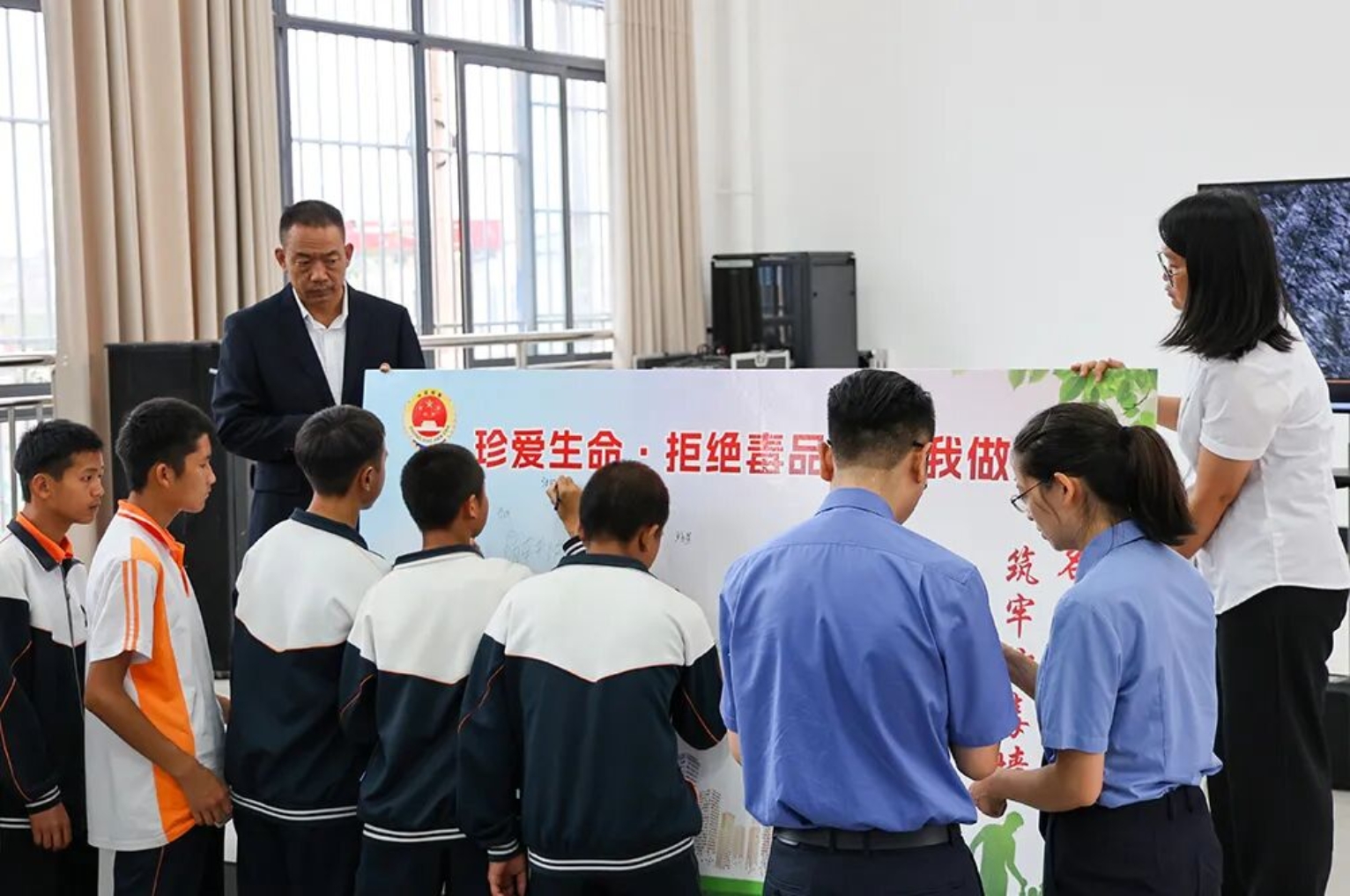 活动现场播放本院原创禁毒作品《毒线不可触、人生不“毒”行》,并现场展示冰毒、“小马”、海洛因等常见毒品模型,生动揭示毒品危害,强化学生识毒、防毒、拒毒意识。同学们随后在“珍爱生命、远离毒品”签名墙上郑重签名,表达坚决抵制毒品的决心。